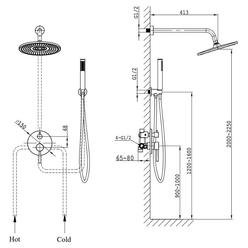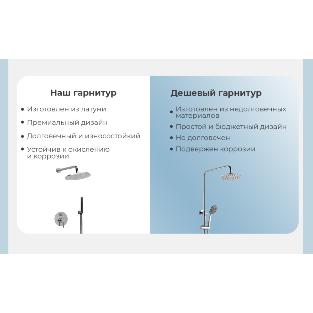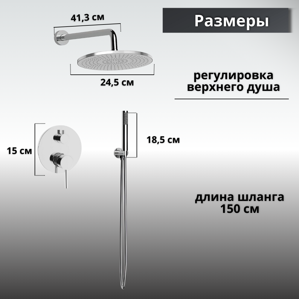 смеситель; монтажный блок; верхний душ; кронштейн верхнего душа; ручной душ; душевой шланг; настенный держатель; инструкция.